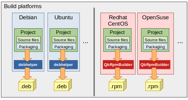 To describe the role and the content of QbRpmBuilder, we can imagine a project that contains a software source code and a bunch of scripts to generate the linux packages.